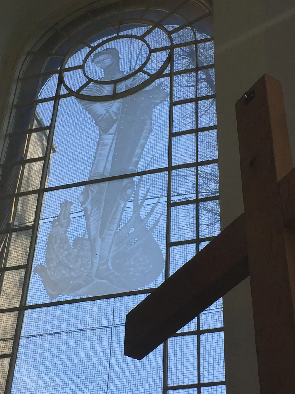 In 1965, a new window was installed above the South door to block a draught. A dove on the outside wall symbolizes the Holy Spirit.