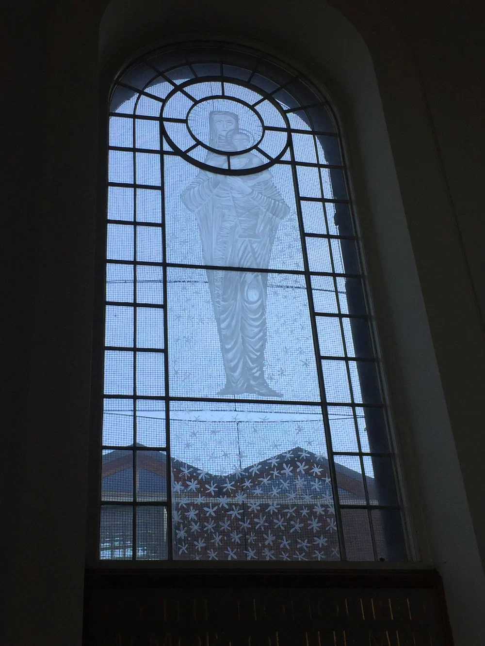 The East windows were replaced with two engraved glass memorials (in the Lady Chapel and Baptistery) by John Hutton, who also worked on Coventry Cathedral.