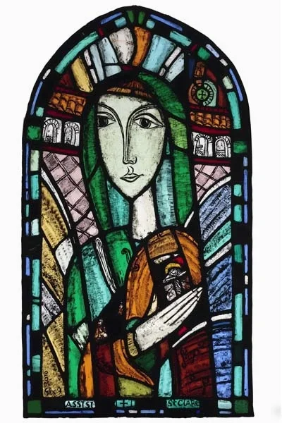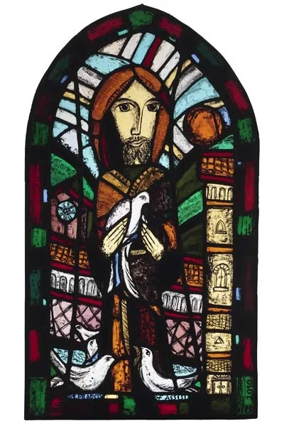Tricker was first drawn to the figure of St Francis of Assisi in 2005, producing a series of works tracing Francis’ life from the son of a wealthy merchant to devoted follower of Christ, at one with all the animals of God’s creation, founder of the Franciscan friars, famed preacher, and symbol of Christian piety, humility and charity. In 2010, Tricker returned to St Francis, and his follower St Clare of Assisi, founder of the Order of the Poor Ladies, now known as the Poor Clares, with these two works. Tricker first started creating stained glass for his series, The Christ Journey, which included St Francis and St Clare and was exhibited at Gloucester Cathedral and Westminster Cathedral. Using found pieces of glass, Tricker crafts stained glasses with fragments of luminous colour.