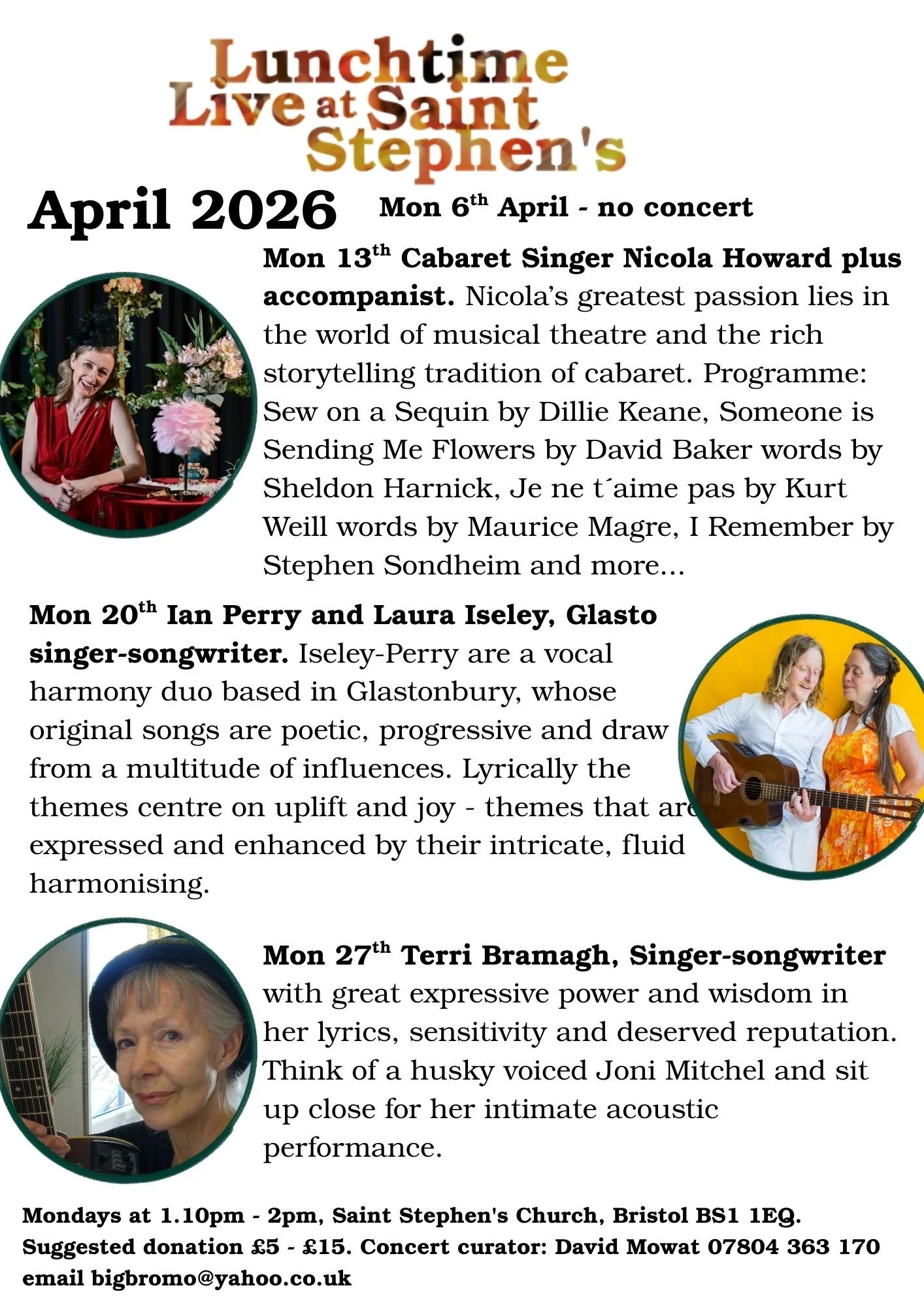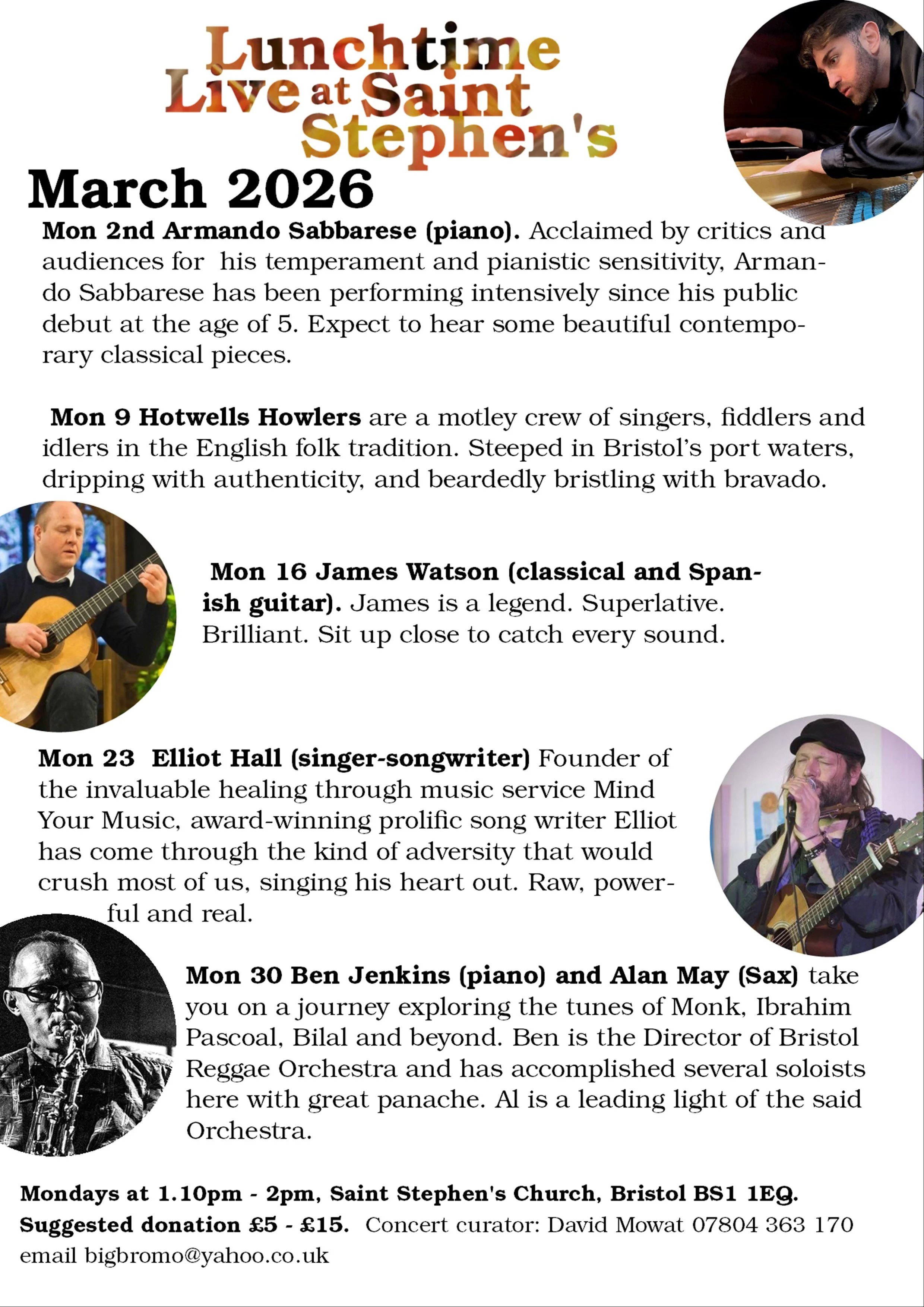 Saint Stephen's has for some years been hosting both regular concerts (Monday Lunchtime Live and the Bristol Song Recitals) as well as one-off evening concerts. Below is a selection of upcoming and previous concerts.